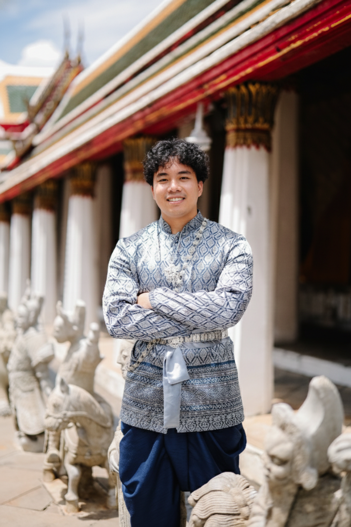 Finished with a classic waist sash, the look conveys strength, confidence, and cultural pride. Ideal for temple visits, weddings, cultural ceremonies, performances, and heritage photoshoots, this costume is perfect for those seeking an authentic Thai look with a strong, masculine presence and timeless appeal.