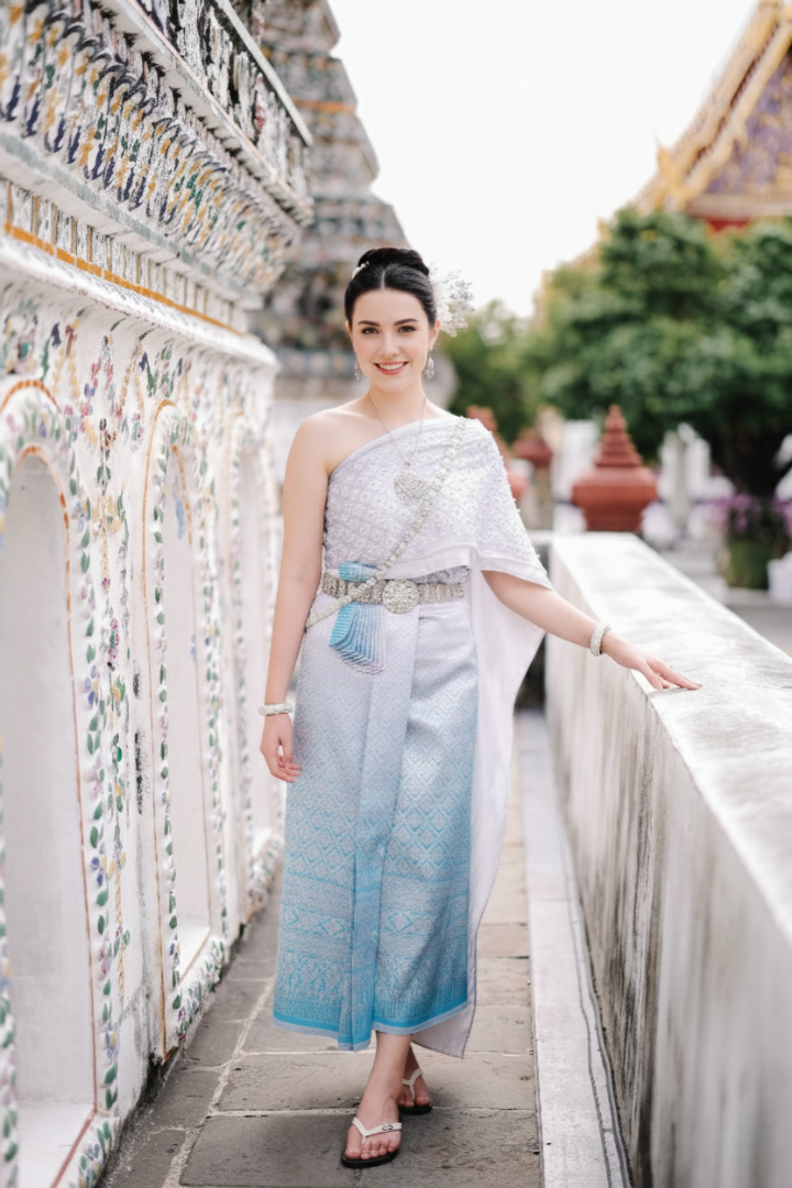 Embrace soft elegance with the Celestial Pearl, a refined interpretation of classic Thai grace. This stunning ensemble features a delicately woven ivory sabai draped over the shoulder, paired with a serene sky-blue silk pha nung adorned with traditional Thai motifs. Finished with a silver-toned belt and subtle jewelry accents, this look radiates purity, calm, and royal sophistication.