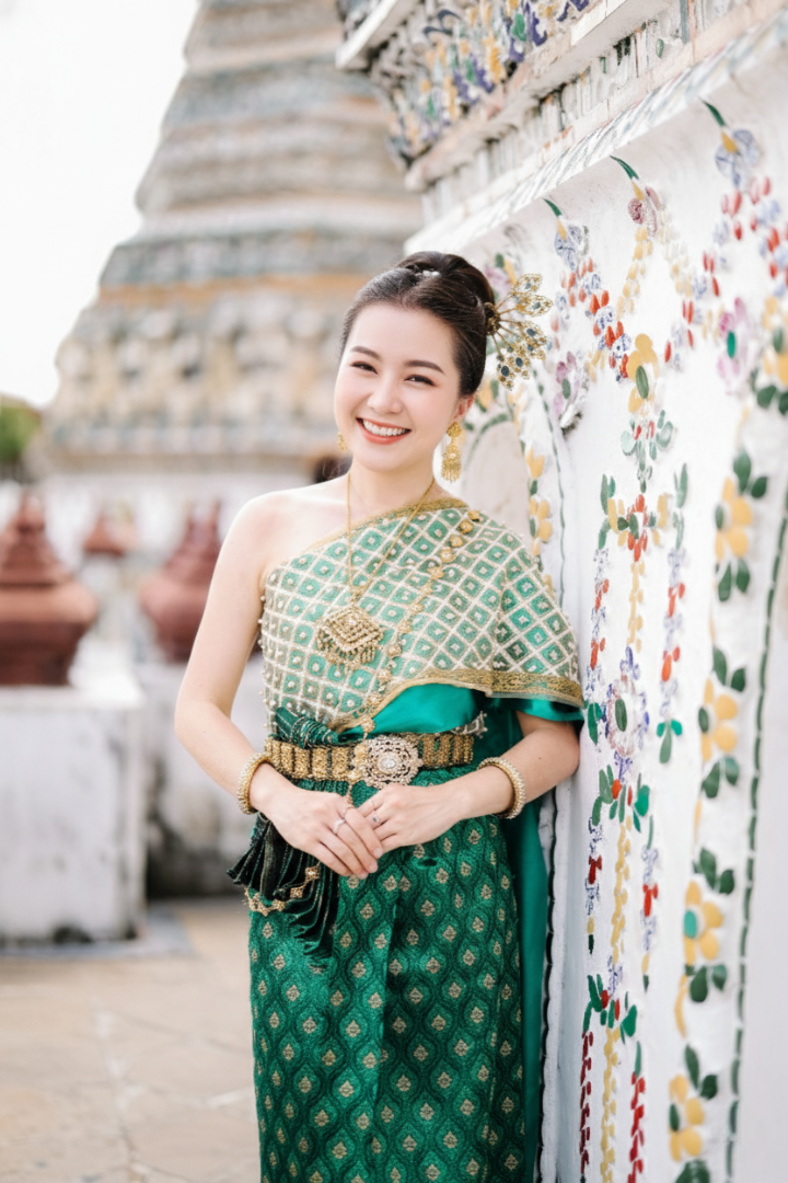 Inspired by classical royal attire, the Emerald Elegance Chut Thai is a refined Traditional Thai costume that embodies grace, heritage, and timeless beauty. Crafted in rich emerald-green patterned fabric, this ensemble features the iconic sabai drape over one shoulder, paired with an intricately woven pha sinh and finished with an ornate traditional belt.