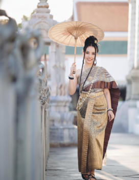 Unleash timeless strength and regal beauty with the Royal Bronze. Designed for the bold and elegant woman, this one-shoulder Chut Thai features a lustrous bronze gold brocade sabai and matching pha nung (skirt) in a traditional diamond pattern. The rich earth tones are enhanced by intricate gold accents, pleated silk trim, and traditional jewelry creating a striking fusion of cultural elegance and modern empowerment.